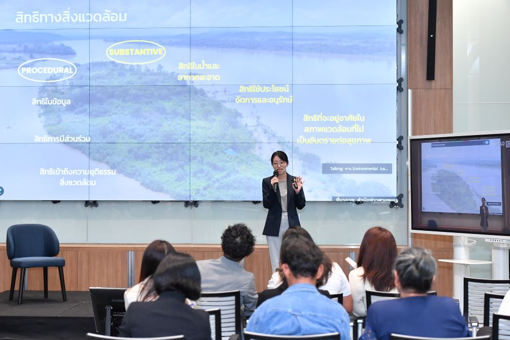 วงเสวนาเริ่มด้วย ธนพร เตชฤทธิพิทักษณ์ Senior Programme Development Officer, TIJ Academy เป็น Keynote Speaker ชวนคิดถึงประเด็นความยุติธรรมสิ่งแวดล้อมและความยุติธรรมสำหรับคนว่าเกี่ยวข้องกันอย่างไรบ้าง โดยระบุว่าปัญหาสิ่งแวดล้อมนั้นเกิดได้ทั้งในมิติของความสมบูรณ์ทางชีวภาพ ปัญหามลพิษดิน น้ำ อากาศ และสภาพภูมิอากาศที่เปลี่ยนแปลงไป และสิทธิของคนที่เกี่ยวข้องกับสิ่งแวดล้อมเช่นสิทธิในข้อมูล สิทธิในการมีส่วนร่วม สิทธิการเข้าถึงน้ำและอากาศสะอาด การใช้ประโยชน์จัดการและอนุรักษ์ เป็นต้น