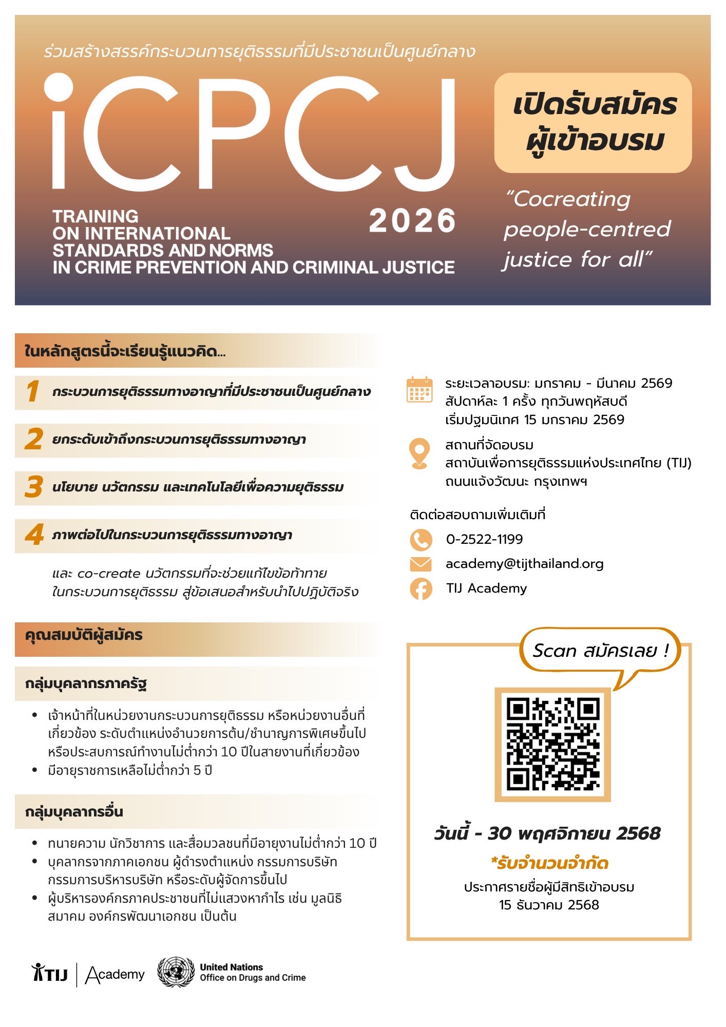 เปิดรับสมัครแล้ว! หลักสูตรสำหรับ Justice Maker ร่วมเรียนรู้มาตรฐานและบรรทัดฐานระหว่างประเทศ และนวัตกรรมเชิงกระบวนงาน เพื่อยกระดับกระบวนการยุติธรรมอย่างเป็นรูปธรรมกับ หลักสูตร iCPCJ 2026 Training on International Standards and Norms in Crime Prevention and Criminal Justice หลักสูตรอบรมการอนุวัติมาตรฐานและบรรทัดฐานระหว่างประเทศเพื่อพัฒนากระบวนการยุติธรรม รุ่นที่ 3